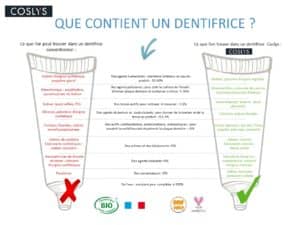 Pensez à lire les composants afin d’éviter le triclosan : cet ingrédient à la fonction antibactérienne est particulièrement utilisé dans les dentifrices conventionnels (interdit dans le cahier des charges cosmebio). En juin 2017, 200 scientifiques ont signé un appel sur les dangers de cet ingrédient suspecté d’être un perturbateur endocrinien.